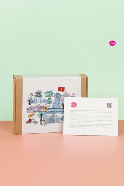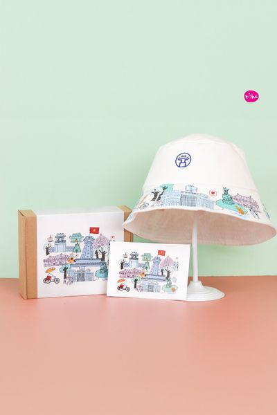 Bộ quà tặng lần này bao gồm túi tote & mũ, ứng dụng từ tranh vẽ của các nghệ sĩ đặc biệt tại lớp đào tạo nghệ thuật chuyên sâu Tòhe. Qua nét vẽ hồn nhiên, trong trẻo của các em, món quà gửi đến bạn bè quốc tế câu chuyện về một Hà Nội thật bình yên mà năng động, một vùng đất với thật nhiều điều tuyệt đẹp để khám phá. Đó có thể là Hồ Gươm với Tháp Rùa cổ kính, là gánh hàng rong thân quen trên góc phố, cốc cà phê thơm lừng hay món phở trứ danh.